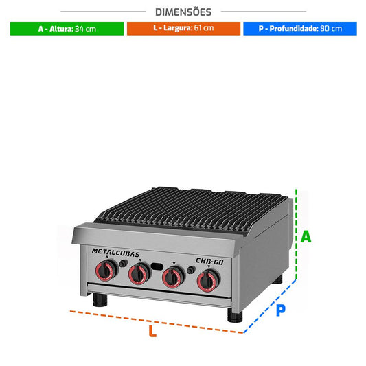 --Fornecedor:Char Broiler Chapa Grill Premium 60cm Profissional Aço Inox a Gás Chb-60 g2 - Metalcubas 26389METALCUBASPreço normal R$ 4.704,34 12x de R$ 392,02 sem jurosPreço normalPreço unitário / por