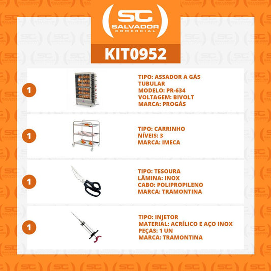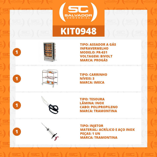 --Fornecedor:Assador de Frango Gás 6 Espetos Infra Pr-631 + Tesoura + Carrinho Inox + Injetor de TemperosPROGASPreço normal R$ 6.599,81 12x de R$ 549,98 sem jurosPreço normalPreço unitário / por