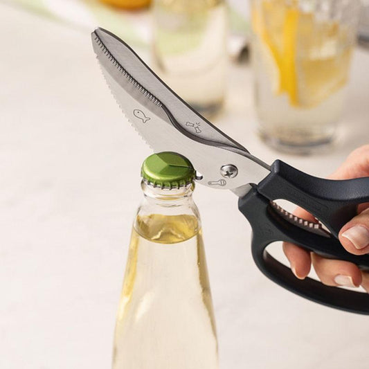 Tesoura de Cozinha: Essencial para cortar ervas, temperos, embalagens, sacos plásticos e até mesmo carnes e aves (com lâminas mais robustas e desencaixáveis para limpeza). Geralmente feitas de aço inoxidável para resistência à corrosão.