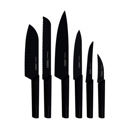 --Fornecedor:Jogo de Facas Nygma Lâminas em Aço Inox Texturizados Preto 6 Peças - TramontinaTRAMONTINAPreço normal R$ 288,84 12x de R$ 24,07 sem jurosPreço normalPreço unitário / por